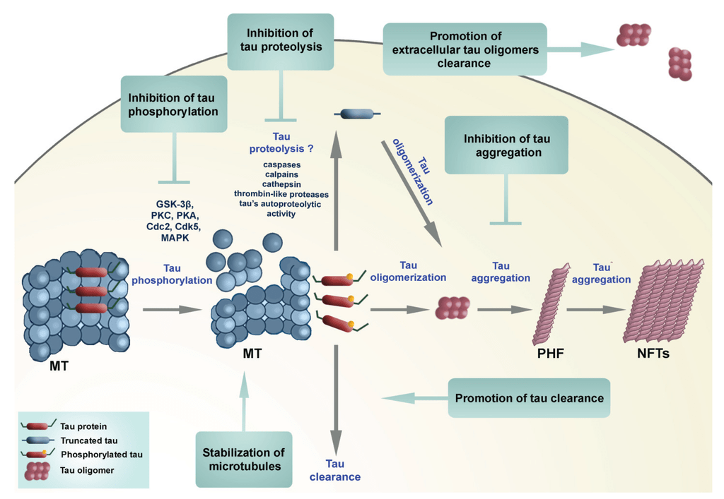*Note about tau phosphorylation (intricacies): Under physiological conditions, tau binds and stabilizes neuronal microtubules (MT). In disease states, tau becomes abnormally phosphorylated by kinases (e.g.,GSK-3β, Cdk5, MAPK, which are the more “reputable” ones), reducing MT binding and increasing the pool of soluble tau. Detached tau may then go through proteolysis to generate products that promote misfolding, then self-associate into toxic tau oligomers. They are small, soluble clusters made of a few tau molecules (intermediate assemblies that are larger than single tau monomers but not yet formed into long fibrils). These oligomers can then aggregate into paired helical filaments (PHFs) and then finally neurofibrillary tangles (NFTs).